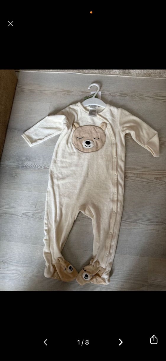 Uzun kollu, yuvarlak yakalı, yumuşak ve sıcak kumaştan yapılmış beyaz bebek tulumu. Ayıcık desenli baskı ve kolay giydirme için düğmeli detaylar içerir.