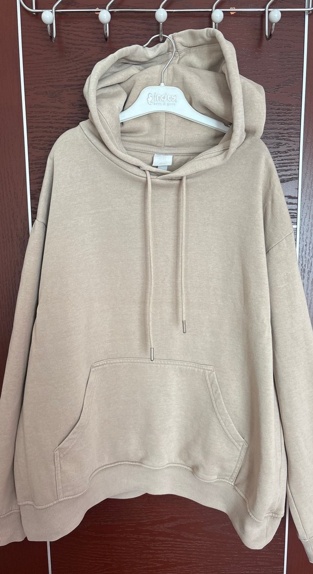 Bej renkli, salaş kesim ve uzun kollu, yumuşak ve sıcak kumaştan kapüşonlu sweatshirt. Yuvarlak yaka ve ön cep detayına sahiptir. az kullanildi defosu yoktur