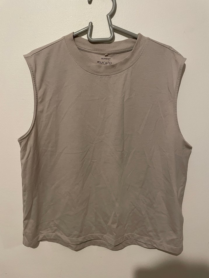 Kolsuz, bej renkli kadın atleti, yuvarlak yaka ve bol kesim.
