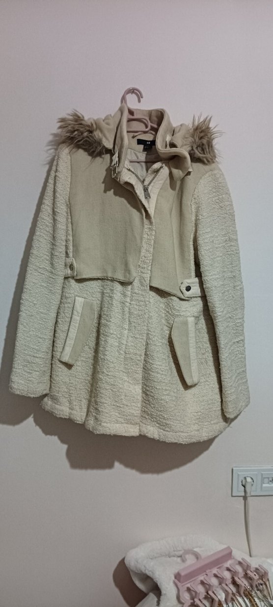 Bej renkli, mini uzunlukta, bol kesim kadın mont. Uzun kollu, kürklü kapüşonlu ve yumuşak dokulu rahat bir tasarım.
