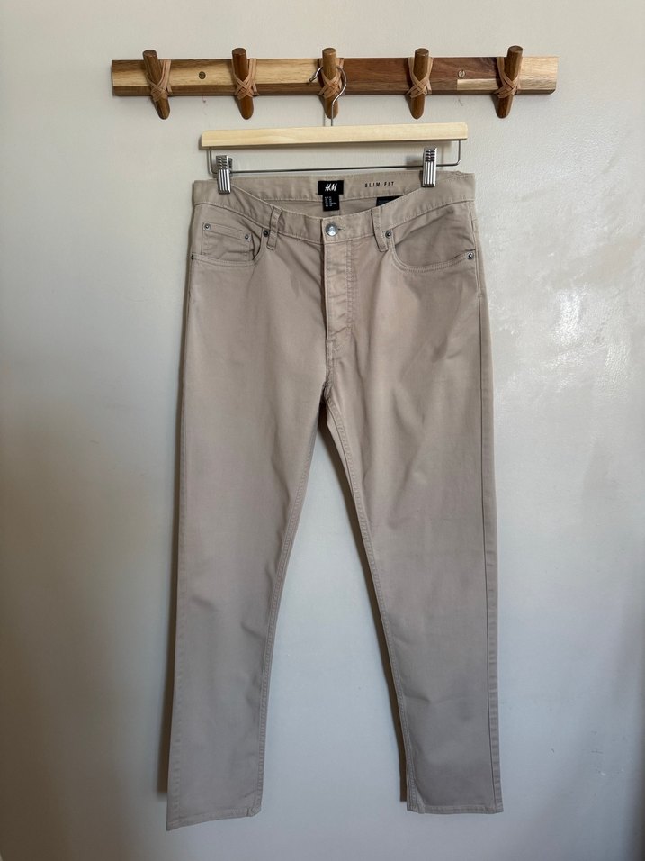 H&M Bej Pantolon, 40 Beden Slim Fit Bel:38cm Paça Genişliği:14cm Baldır Genişliği:22cm Boy: 101cm Paça Payı Yoktur.