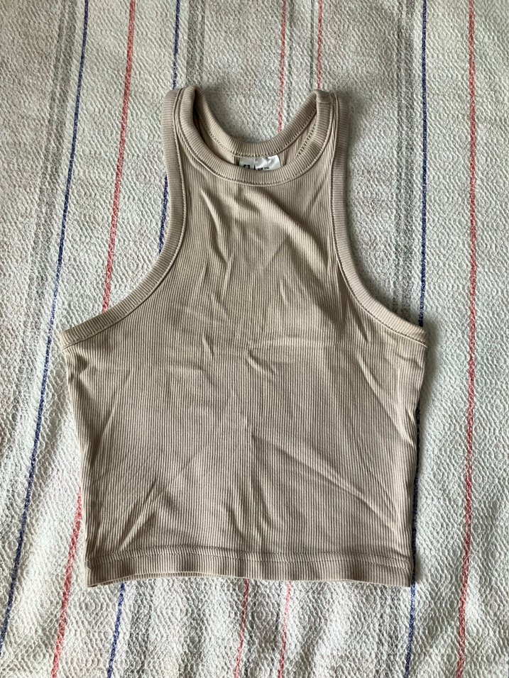 Bej renkli, yüksek yakalı ve kolsuz, pamuklu ve elastan kumaştan yapılmış, vücuda oturan crop top. rahat ve şık. 2xs beden