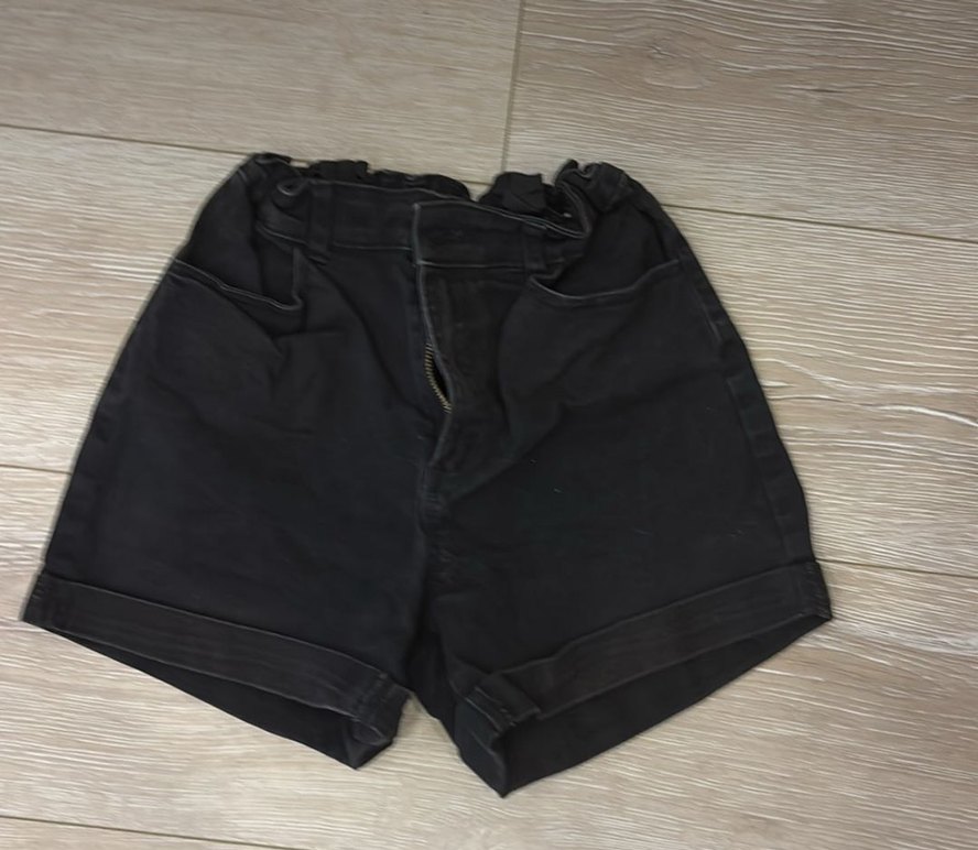 Siyah renkli, kemerli ve bol kesim kot şort. Günlük kullanıma uygun, rahat ve trend sokak stiliyle uyumlu.