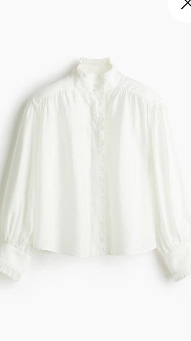 H&M Beyaz uzun kollu gömlek, yüksek fırfırlı yakası ve bol kesimiyle sade tasarıma sahip, ofis ve günlük kullanımı için uygun.HM marka M beden beyaz fırfırlı gömlek az kullanılmış sorunsuzdur