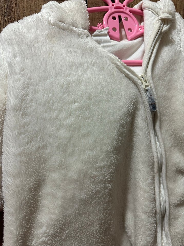 Beyaz renkli, kürklü detaylı, yakalı bebek mont. Sıcak tutuyor içi aatarlı