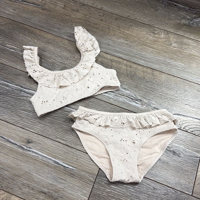 Nakışlı detaylara sahip beyaz kız çocuk bikini, plaj için bohem tarzda tasarlanmıştır. Üst ve alt kısımda fırfır detayları bulunmaktadır.