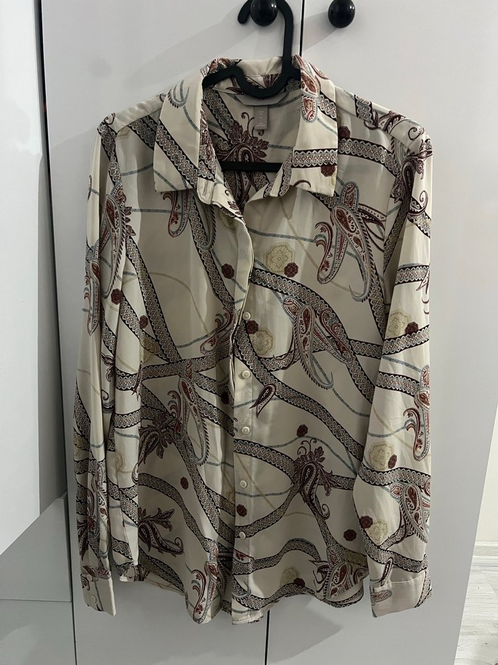 Bohem tarzda, yılan desenli, düğmeli ve yakalı uzun kollu kadın gömleği. Gri ve kahverengi tonlarında, yumuşak sentetik kumaştan, bol kesim ve günlük kullanıma uygun.