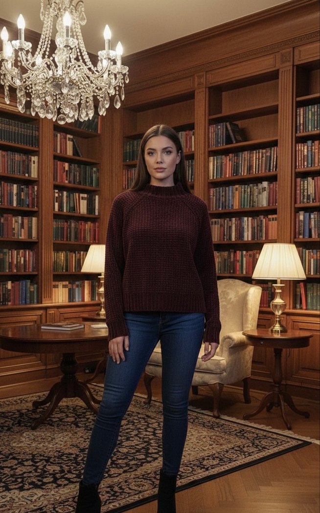 Bordo renkli, uzun kollu kadın kazak. Yün malzemeden örülmüş, rahat kesim ve normal boyda. Ofis için uygun, desensiz tasarım.