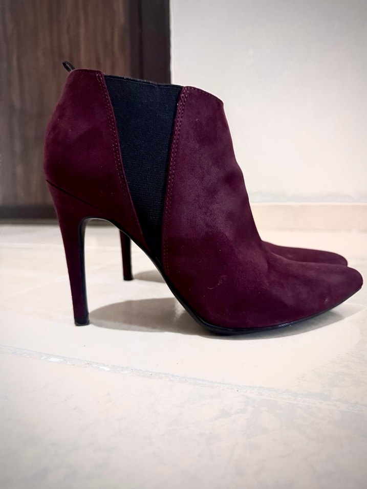 H&M marka Bordo süet malzemeden yapılmış, ince topuklu kadın botları. Cesur, Parisli tarzıyla romantik akşamlar için uygun, desen içermeyen şık tasarım.