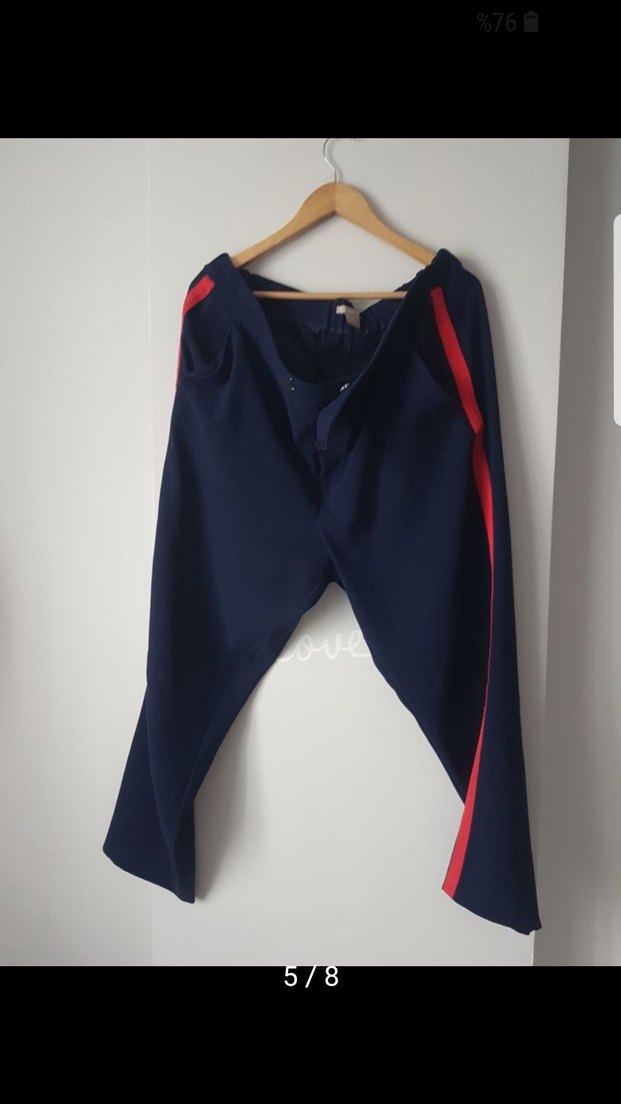 H&M marka,h&m nin buyukbeden koleksiyonundan alindi.ofis ortaminda sayili kullanildi.beden degisimimden sonra kullanilamadi.hasar leke,agda tulerme vs yok Düğmeli, koyu lacivert gibi ama tatli bir mor tonununda oldugu,kadın pantolon, kırmızı yan şeritli. Sentetik kumaştan, normal uzunlukta ve regular fit. Spor ve günlük kullanıma uygun.