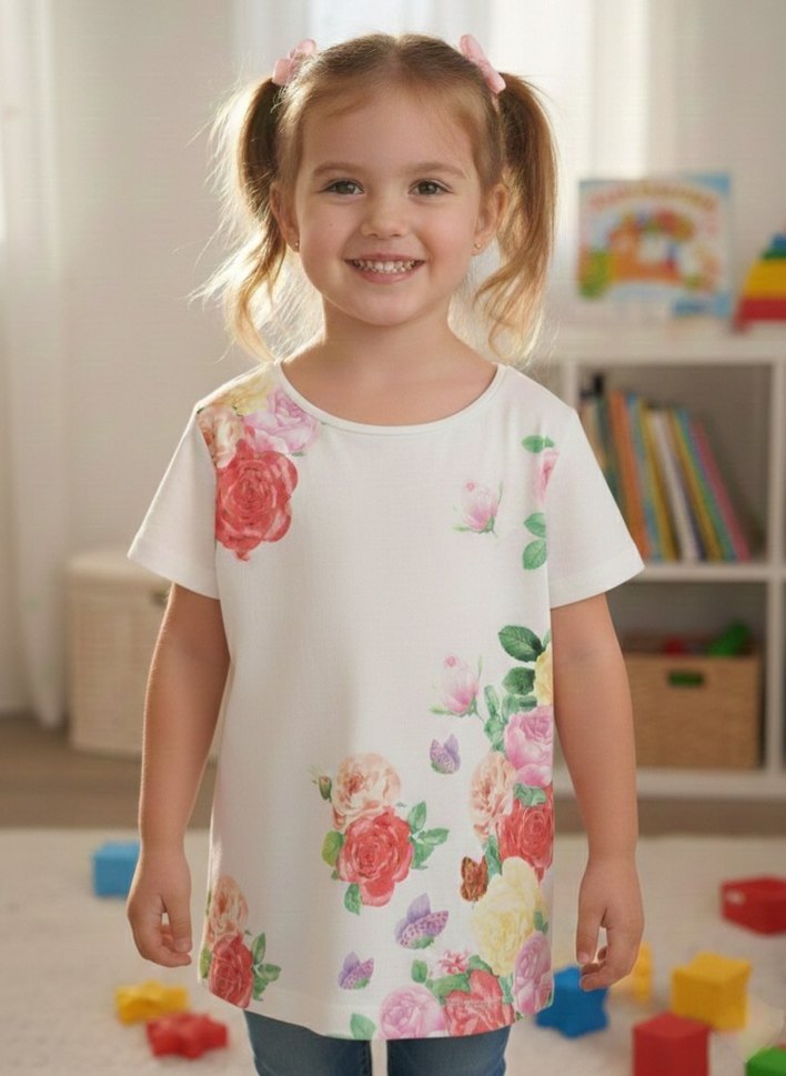 Pamuklu, kısa kollu ve yuvarlak yakalı H&M Marka Çiçek Baskılı Çocuk T-shirt..4-6 yaş için uygundur. En 30 cm Boy 40 cm..