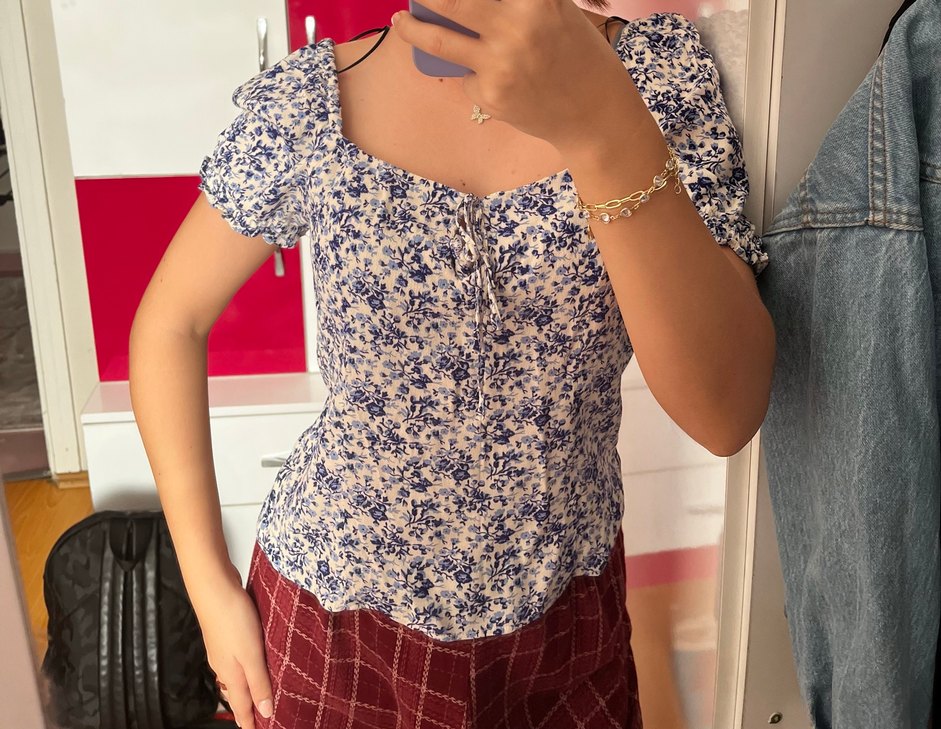 H&M marka, mavi-beyaz çiçek desenli, puf kollu, ön bağlama detaylı bluz. ✨ Beden: M ✨ Çok az kullanıldı, tertemiz ✨ Kumaşı hafif ve ferah ✨ Günlük kombinlerde, jean ya da etekle çok şık duruyor