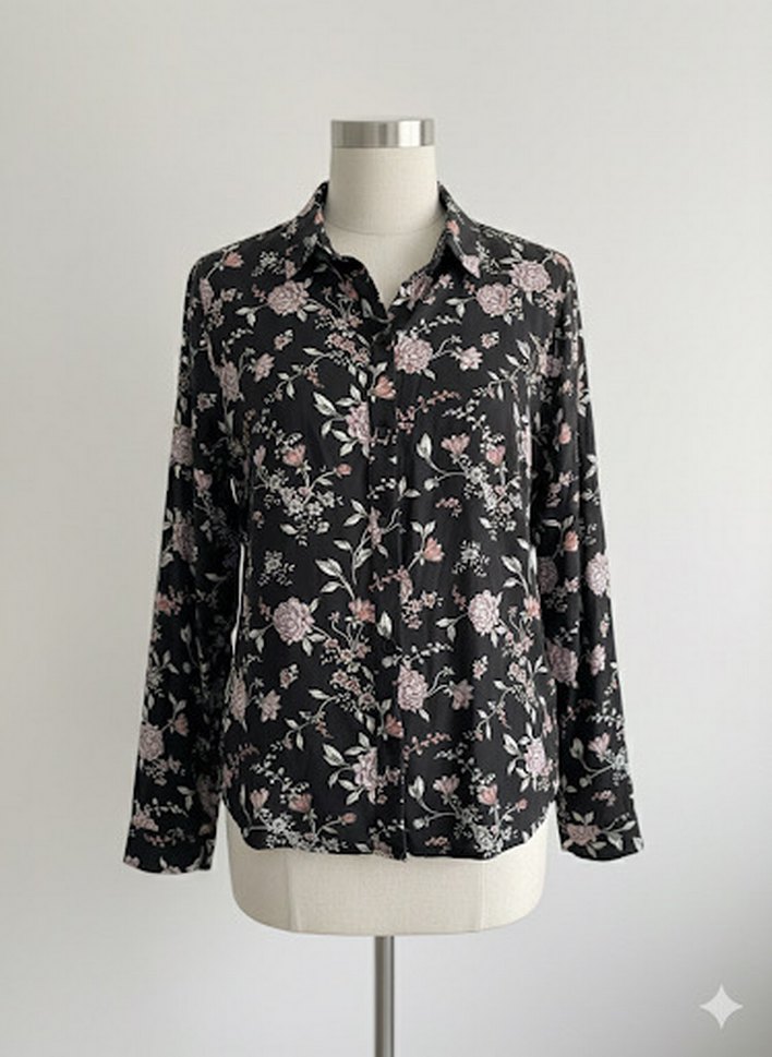 Pamuklu kumaştan, düğmeli ön ve yakalı, çiçek desenli uzun kollu bol kesim kadın gömlek. Günlük kullanıma uygun modern tarzda. H&M orijinal 57 cm boyu