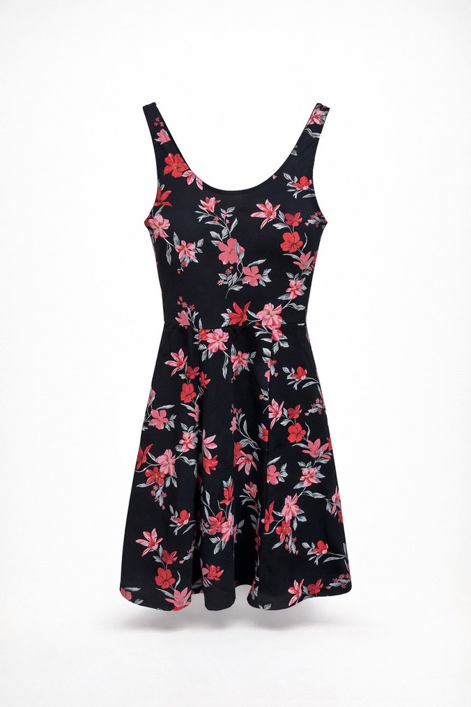 Renkli çiçek desenli, kolsuz, pilili etekli, vücuda oturan midi elbise. Günlük kullanıma uygun şık bir model.
