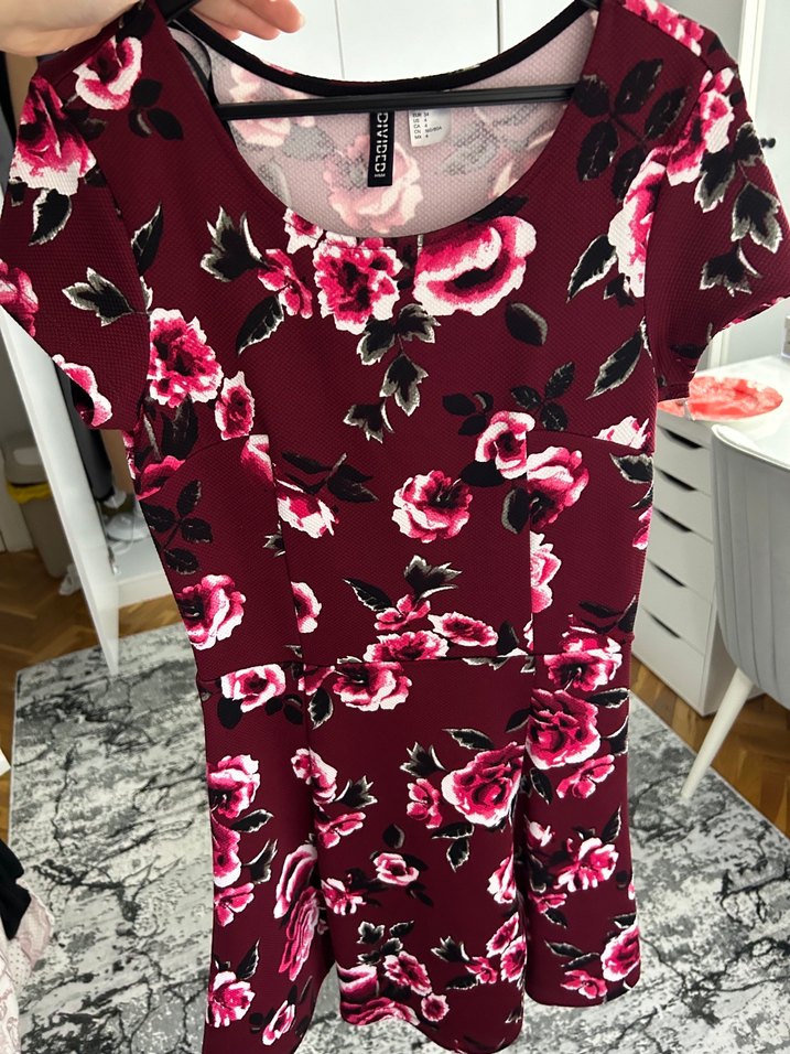 Bordo renkli, çiçek desenli ve fırfır detaylı, v yaka kısa kollu, oturan midi elbise. Sentetik kumaştan, romantik buluşmalar için Paris sokak modası tarzında.