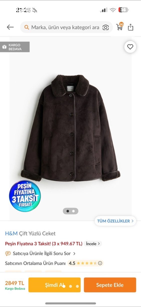 H&M çift yüzlü süet ceket, kürk detaylı yaka ve manşetlere sahiptir. Notlu yaka, uzun kollu ve kısa kesimdir. Minimalist sokak stiline uygundur.