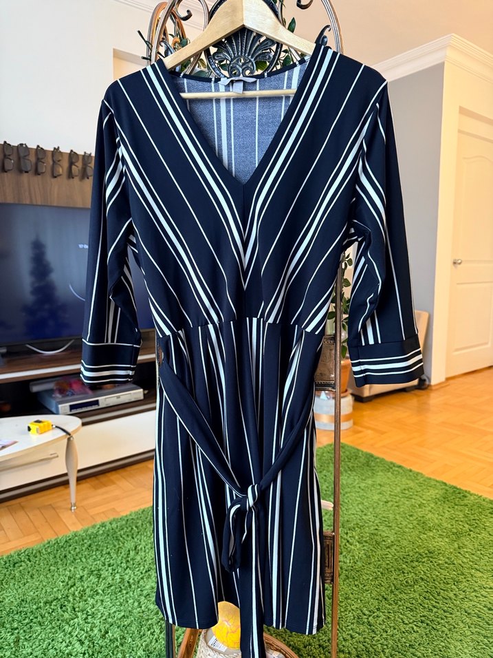 H&M marka siyah-beyaz çizgili diz boy elbisemi satıyorum. Modern görünümü ve çizgili dokusuyla çok şık bir parça. Bu elbiseyle ofis çıkışı şıklığını tam 12’den vuracağınıza emin olabilirsiniz ✨ En sevdiğim tarafı da şu: tam bir “giy-çık” elbisesi. Ne giyeceğinizi düşünmeden, tek parçada stil sahibi görünmenizi sağlayan adeta bir kurtarıcı ❤️ Detaylar: • ✅ H&M marka • ✅ Siyah-beyaz çizgili • ✅ Diz boy • ✅ Kemer detaylı (bel kısmını çok güzel toparlıyor) • ✅ Günlük / ofis / akşam buluşması kullanımına uygun Not: Astarı yoktur. Sorunuz olursa memnuniyetle cevaplarım
