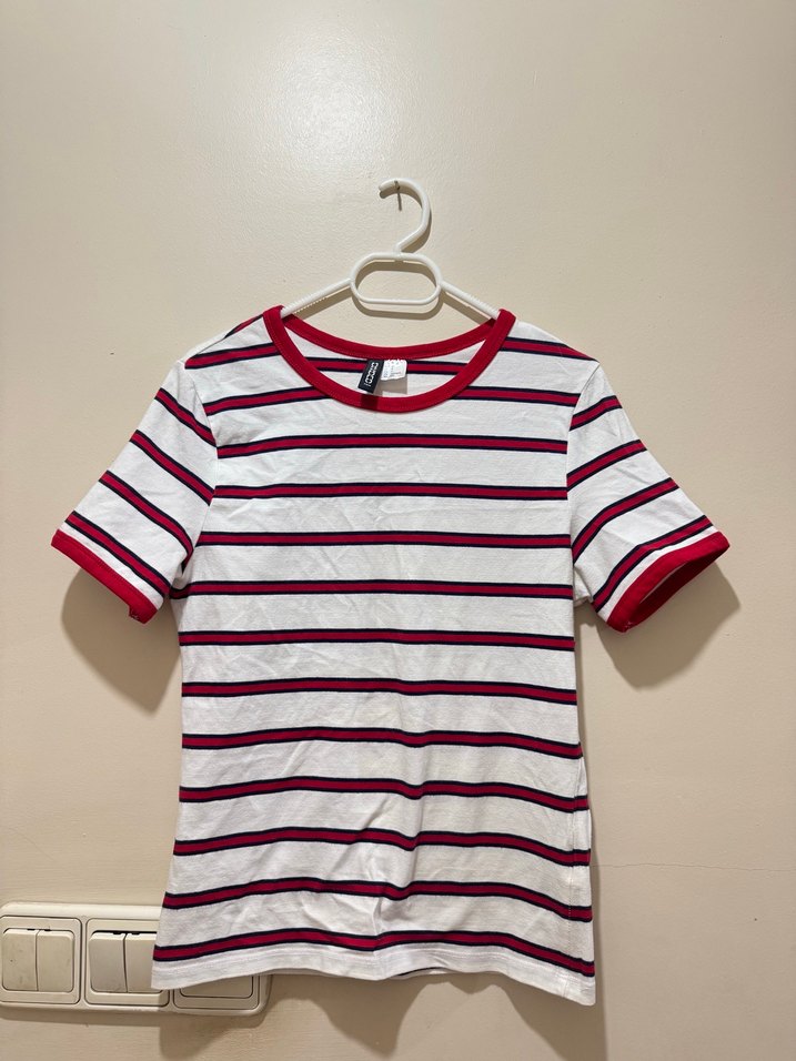 H&M markalı, S beden, pamuklu kumaştan, çizgili ve kırmızı lacivert detaylı, kayık yaka, normal boyda tişörttür. Herhangi bir kusuru vs. yoktur. Artık giymediğim için satıyorum. Dilediğiniz soruyu sorabilirsiniz seve seve yardımcı olurum ❤️ Bu arada satın alırsanız ütüleyerek kargolayacağım