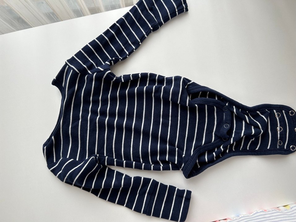 Lacivert çizgili erkek bebek body, uzun kollu, yuvarlak yakalı ve düğmeli. Yumuşak pamuk kumaştan üretilmiştir. Büyütülebilir olduğu için altı aya kadar rahat kullanılır