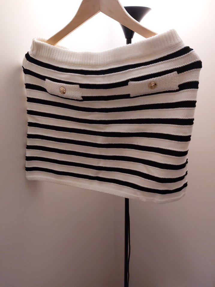 Siyah çizgili, düğmeli beyaz triko mini etek, günlük kullanıma uygun şık ve rahat bir sokak stili sunar. YURTDIŞI ÜRÜNÜ