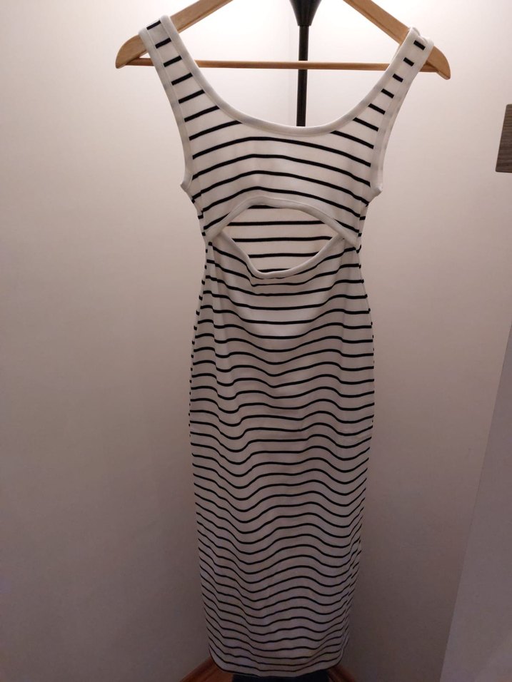 Kolsuz, tekne yaka çizgili elbise, vücuda oturan kesim . Beyaz ve siyah tonlarda, yumuşak sentetik kumaş. YURTDIŞI ÜRÜNÜ