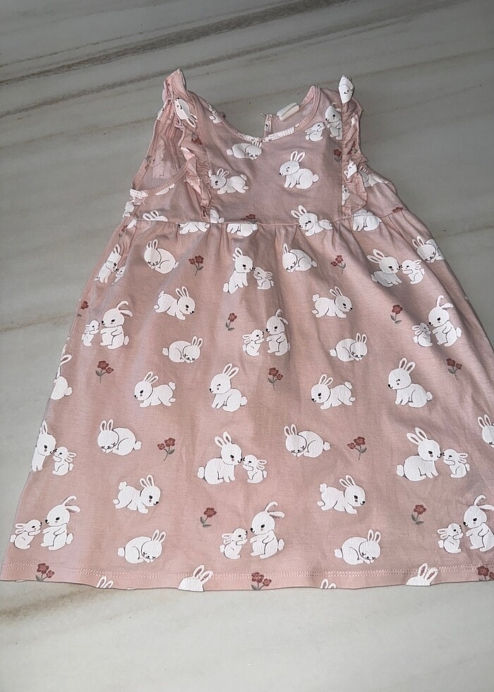 H&M çocuk elbisesi, 100% pamuk, kolsuz, hafif fırfırlı. 2-3 yaş için uygun. Tavşan desenli, arkadan düğmeli.