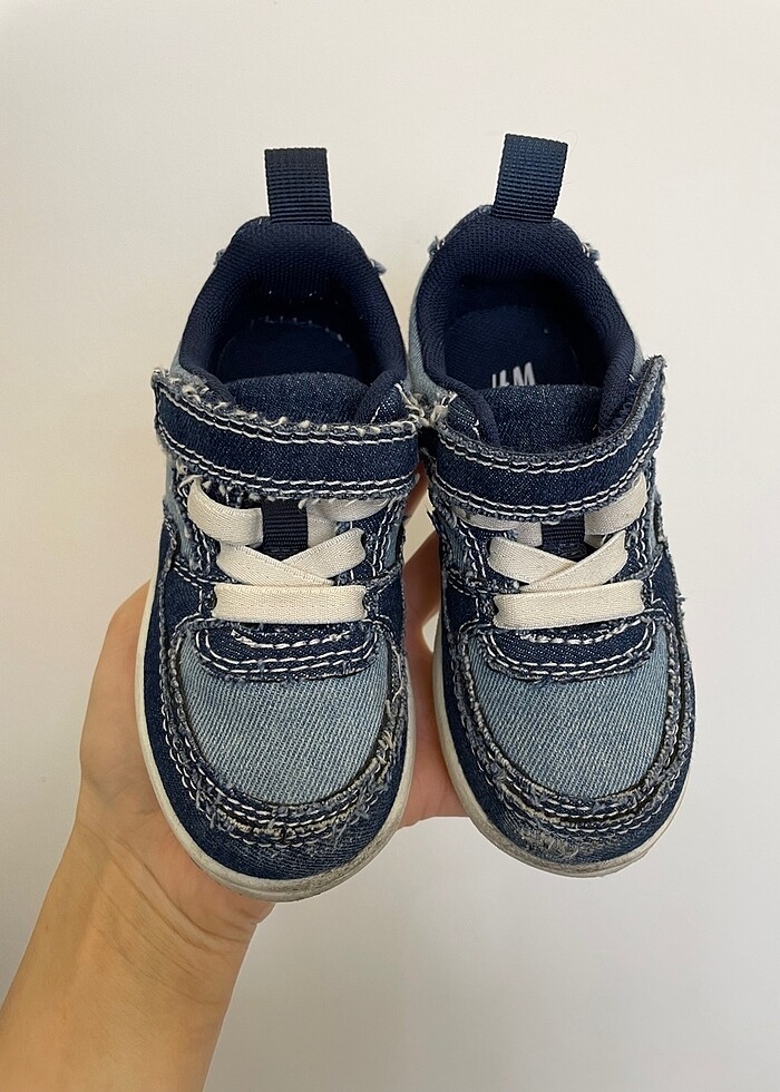 H&m çocuk ayakkabı,kot kumaştır ve ayakta çok hoş duruyor. 2-3 kere giyildi, ayağı birden büyüyünce giyemedi. Son fotoğrafta belirttiğim minik sürtünme dışında bir kusuru yoktu. (Scooter sürerken ayağını sürtünce oldu)