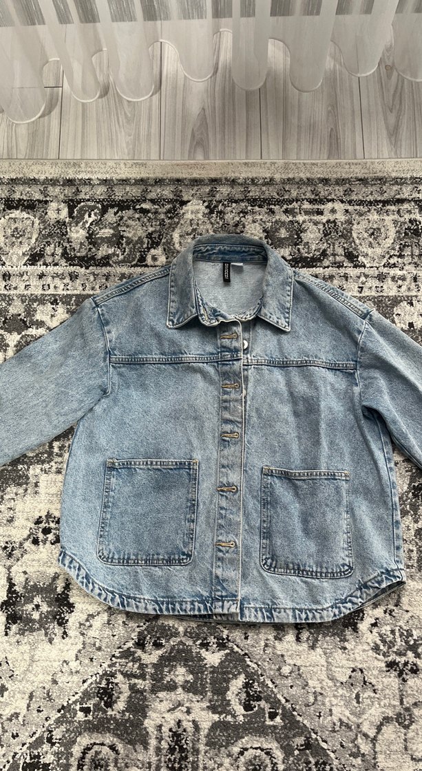 Düğmeli, bol kesim kadın denim ceket. Uzun kollu, yaka kısmı kesik ve gri-mavi tonlarda batik desenlidir. Midi boy, iki ön cebi vardır.