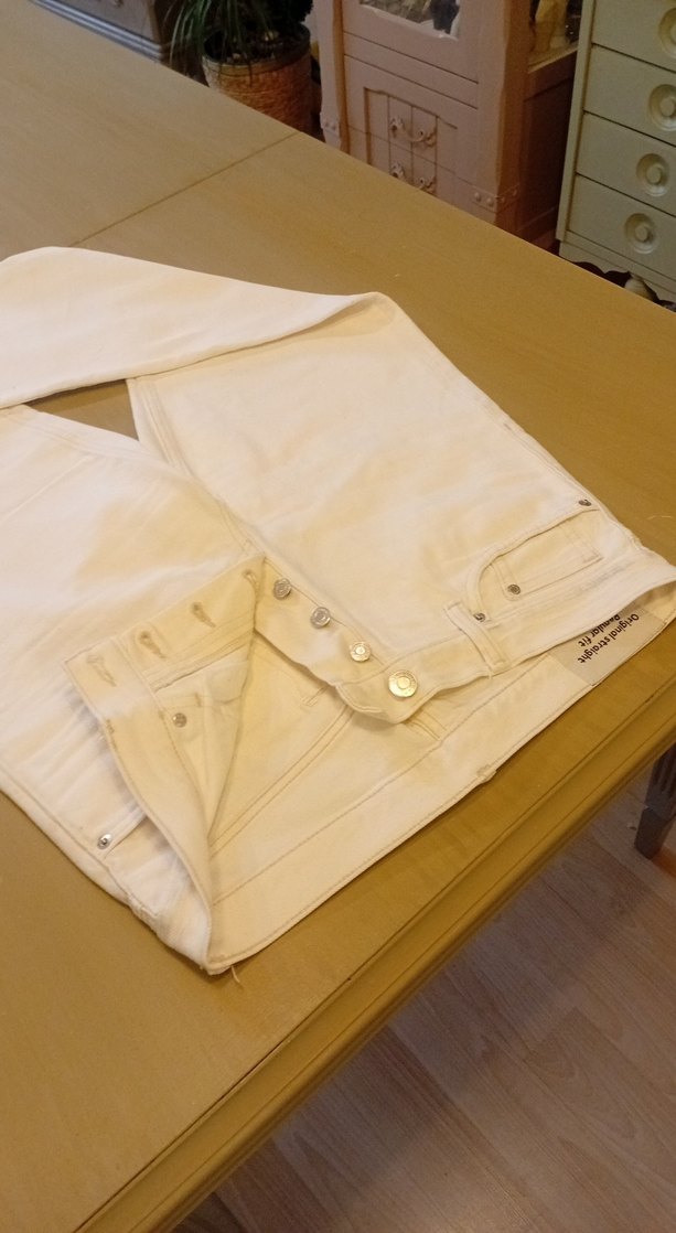 Beyaz keten kadın pantolon, düğmeli, normal midi boyda ve sade minimalist tarzda, günlük sokak giyimi için uygundur. 30/32