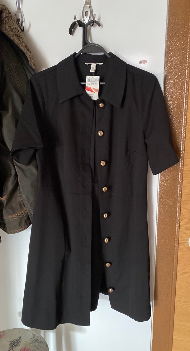 Düğmeli siyah midi hamile ceketi, kısa kollu ve kesimli yakaya sahiptir. Regular fit ve sentetik kumaştan üretilmiştir. Ofis için uygundur. L bedene iyi olacağını düşüyorum. H&m bedenlerinizi biliyorsanız ona göre de alabilirsiniz. Zayıfladığım için satıyorum yoksa çok beğendiğim bir elbise. Hiç giyilmedi etiketli