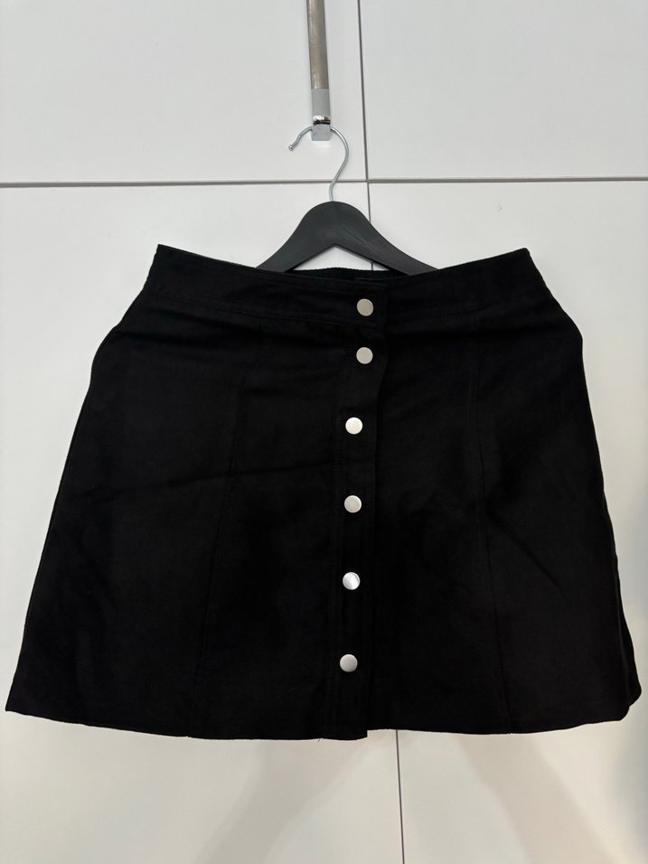 Düğmeli siyah süet mini etek, bol kesim ve minimalist tasarıma sahip, günlük kullanıma uygun. Xs beden