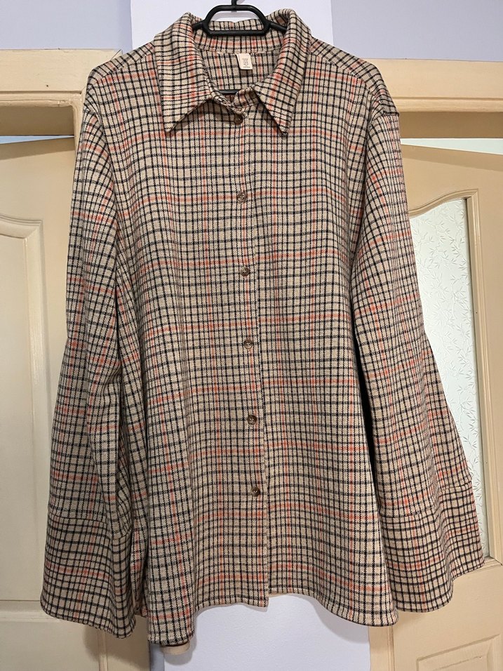 Bej ve gri kareli, keten kumaştan, uzun kollu, düğmeli ve geniş yakalı, bol kesim kadın gömleği. Ofis kullanımı için uygundur. Üstündeki turuncu trikoyu yanında hediye göndereceğim