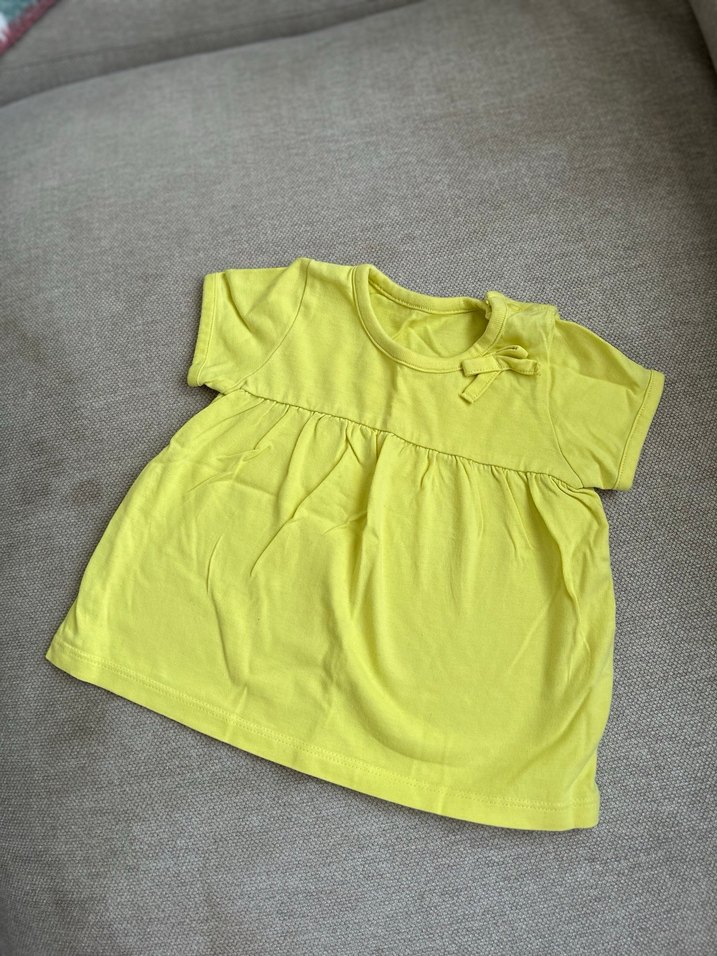 Kız çocukları için kısa kollu, yuvarlak yakalı, fırfırlı detaylı, bol kesim sarı elbise, yumuşak keten kumaştan yapılmıştır. 3-6 için uygun