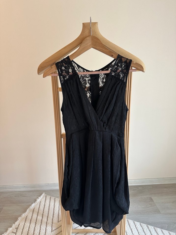 V yaka, sırtı dantel detaylı dekolteli elbise eteği hafif balon tarzı duruyor çok mini değil ama diz üstü ortalama 160cm-164cm boyunda biri için.
