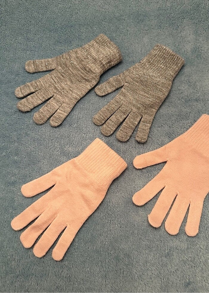 H&M 2li eldiven, pembe&gri simli, 134-170 beden, 8-14 yaş. Bilek kısmı lastik örgülü, yumuşak ince triko eldivenler. Gri simli olanı dokunmatik ekranlarda kullanıma uygundur. Sayılı kullanıldılar, hiçbir kusurları yok, yeniden farksızlar. Berelerin ayrı ilanları bulunuyor, sadece kombinlenmeye uygun olduklarını göstermek için birlikte fotoğrafladım. Bu ilanın fiyatı sadece iki çift eldiven için geçerlidir.