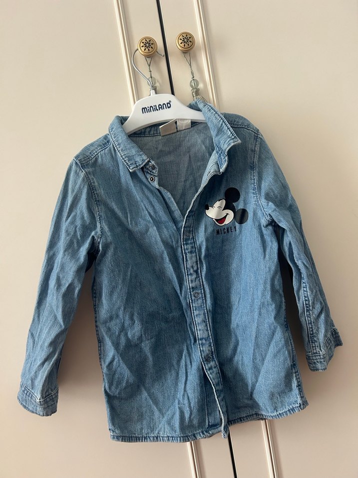 Mavi renkli, düğmeli, uzun kollu ve bol kesim erkek çocuk denim gömlek. Göğüs kısmında baskılı Mickey figürü bulunur. Ürünü bir iki kere kullandık