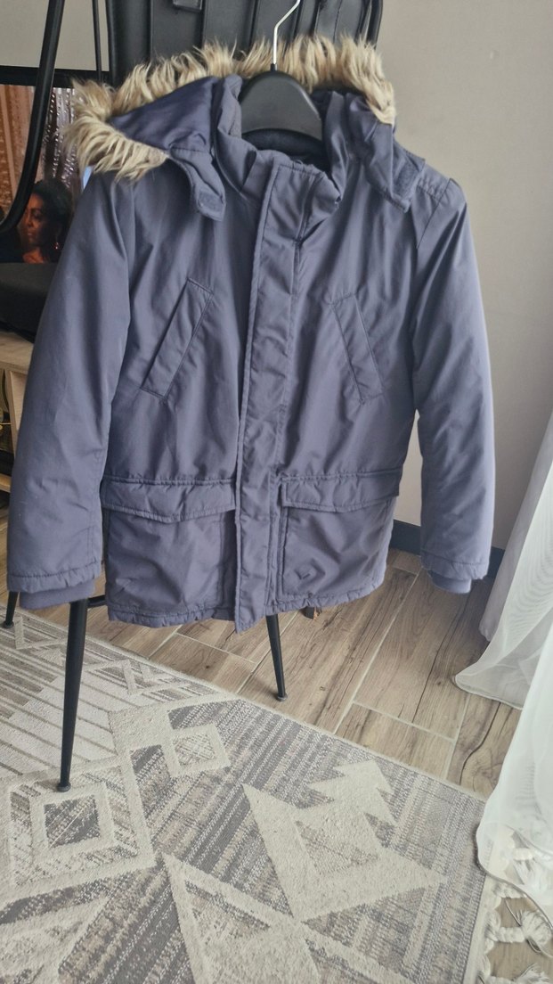 Gri midi boy erkek kaban, kapüşonlu ve kürk detaylıdır. Sentetik kumaştan üretilmiş, rahat kesimi ve uzun kolludur. Dış mekan kullanımı için uygundur. Deformesi yok
