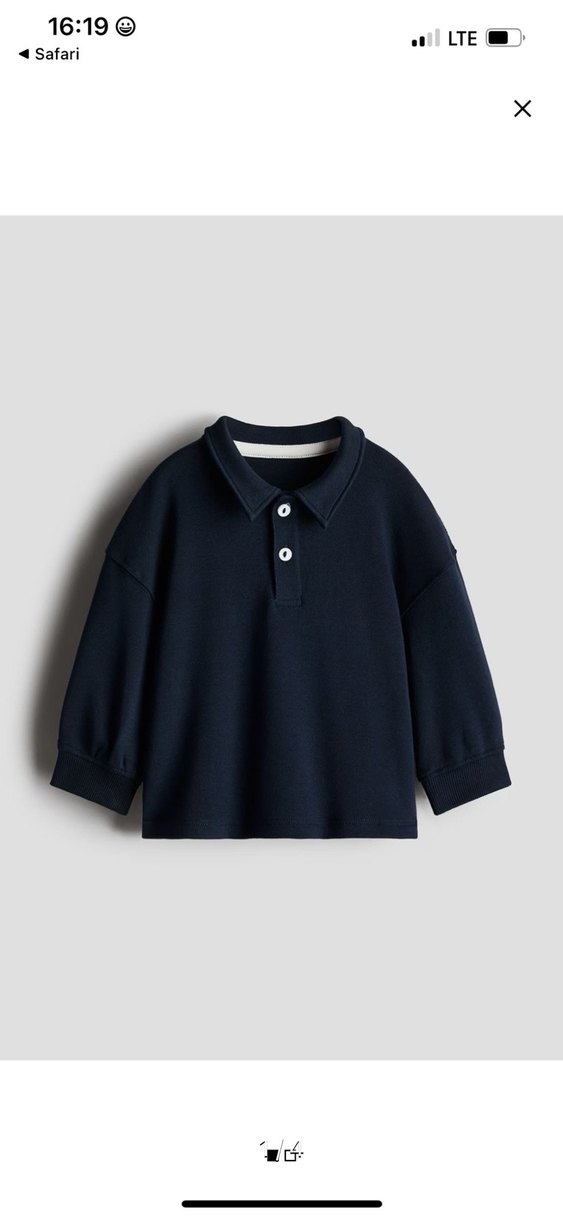Erkek çocuk için düğmeli polo yaka, uzun kollu sweatshirt. Rahat kesimli, yumuşak ve sıcak kumaştan, lacivert renkte sade tasarım. Az kullanıldı 4-6 aya uyumlu