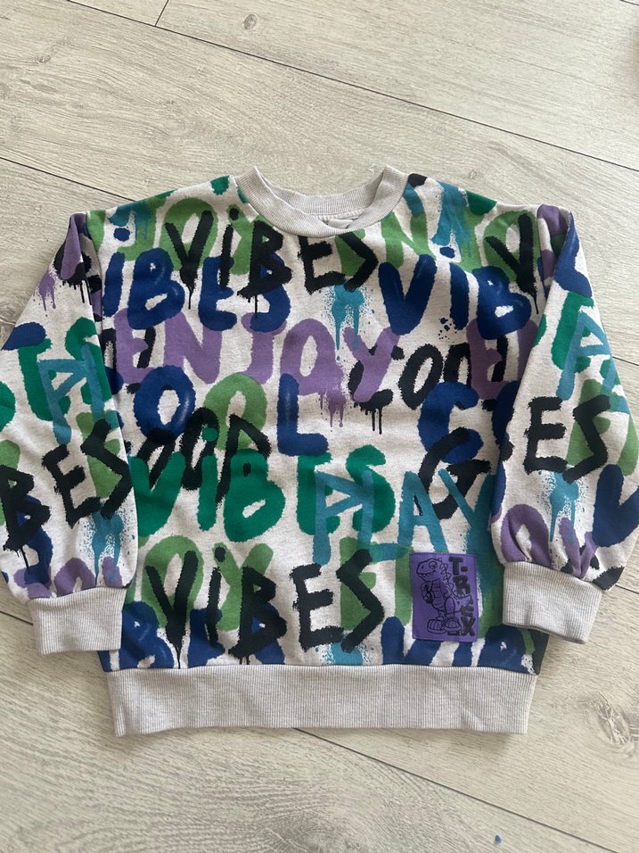 bol kesim, uzun kollu ve bisiklet yakalı, çok renkli baskılı, örme kumaştan sweatshirt. Bohem ve retro tarzda, gri ağırlıklı renklere sahip. İçi polarlıdır 6-8 yaş için uygundur