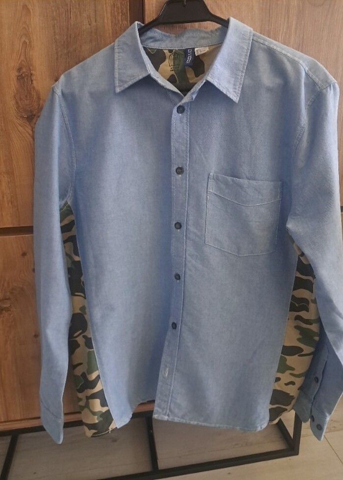 Mavi pamuklu, kamuflaj desenli H&M erkek gömlek. Hic giyilmedi. Etiket mevcut değil.(M) beden.