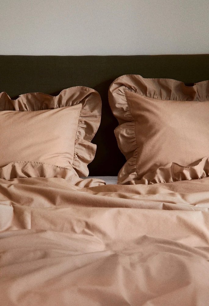 200x220 Pamuklu perkalden, çevresi gösterişli farbalalı iki yastık kılıfı ve bir yorgan kılıfı içeren nevresim takımı. Yastık kılıflarının zarf şeklinde klasik bir açıklığı, yorgan kılıfının altta gizli çıtçıtlarla kapanan bir açıklığı bulunur. Perkal, hafif ve hava alan bir yapıya sahip, pürüzsüz ve ince dokulu bir kumaştır. Article Description Tozlu kahverengi Düz renkli