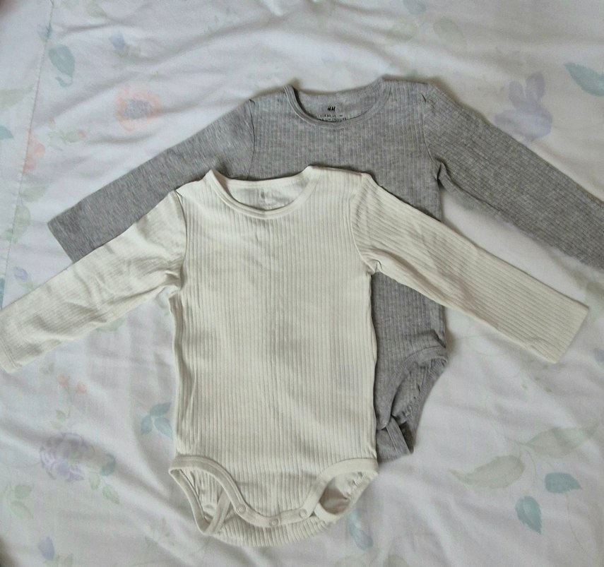 Kırık beyaz ve gri renklerde, uzun kollu, ince ribanalı kumaştan yapılmış, yuvarlak yakalı iki bebek body seti. 9-12 ay. Bir kez giyildi tülerme leke ve defosu yok.