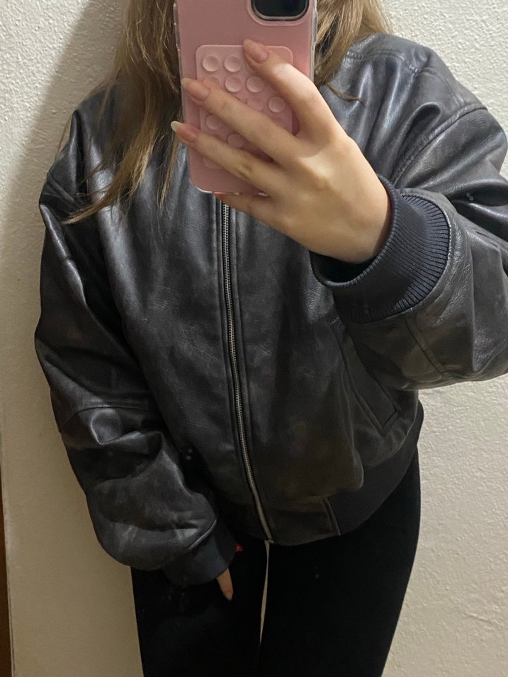 Gri deri, uzun kollu, fitted kesim kadın ceket. Grunge punk tarzında, günlük kullanım için uygundur.
