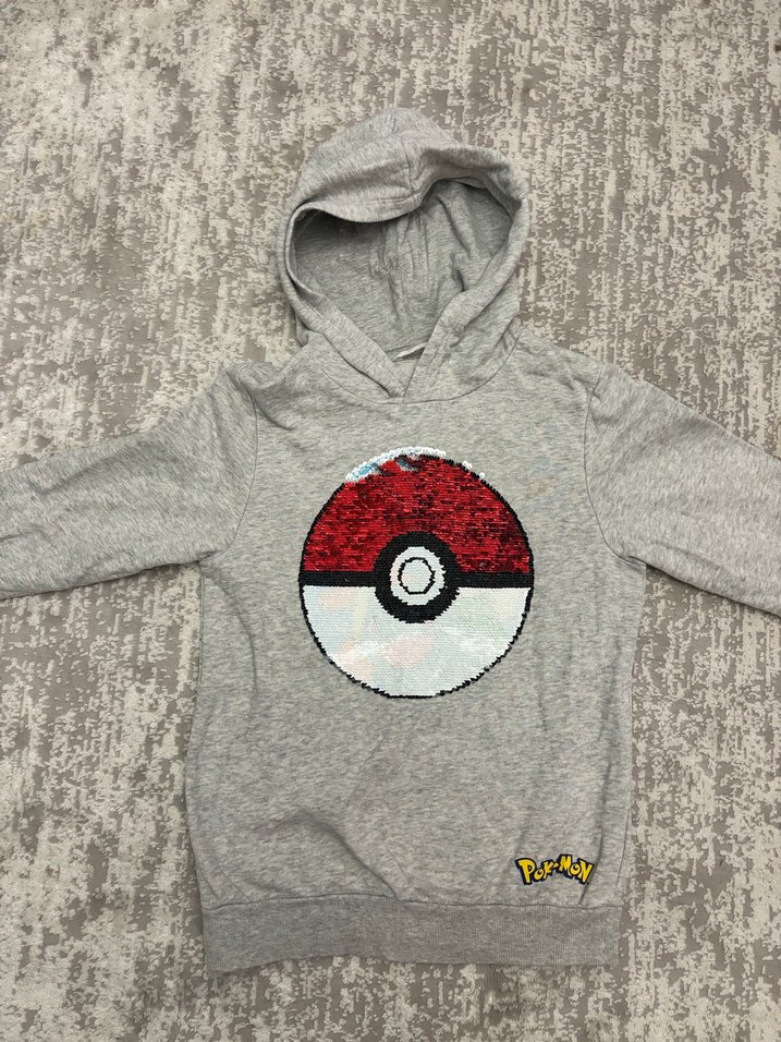 Gri kapüşonlu erkek çocuk sweatshirt, rahat kesim ve yumuşak, sıcak kumaş üzerine baskılı ters çevrilebilir pul desenlidir. Sokak giyimi için uygun. Tertemiz