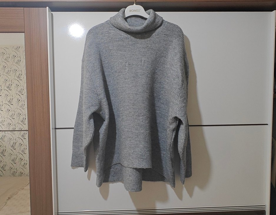 H&M Gri renkli, boğazlı ve bol kesim triko kazak. Uzun kollu ve normal boyda, günlük kullanıma uygundur. ölçüler iki kol altı arası 66 cm ön boy 61 cm arka boy 70 cm