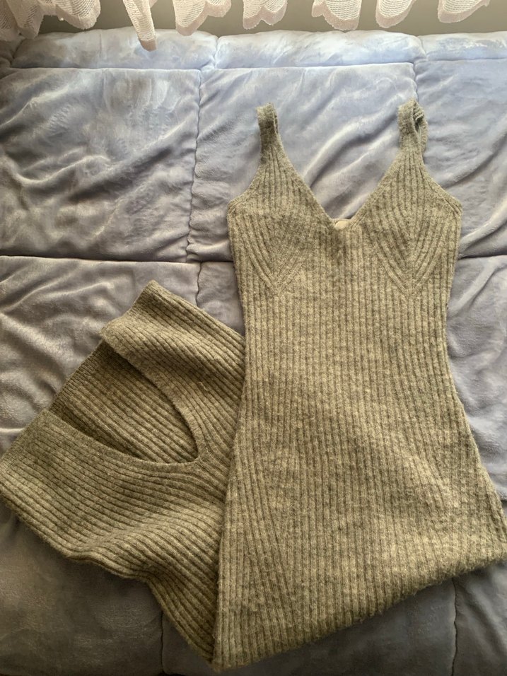 V yaka, kolsuz, uzun ve vücuda oturan bu triko elbise, yumuşak gri kumaştan yapılmıştır. Rahat ve bohem tarzda, günlük kullanıma uygundur.
