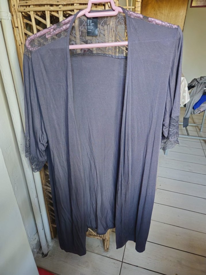 Geniş kesim, uzun gri sabahlık; uzun kollu ve bohem tarzda, omuzlar ve manşetlerde dantel detaylı, rahat bir modeldir. Marka H&M
