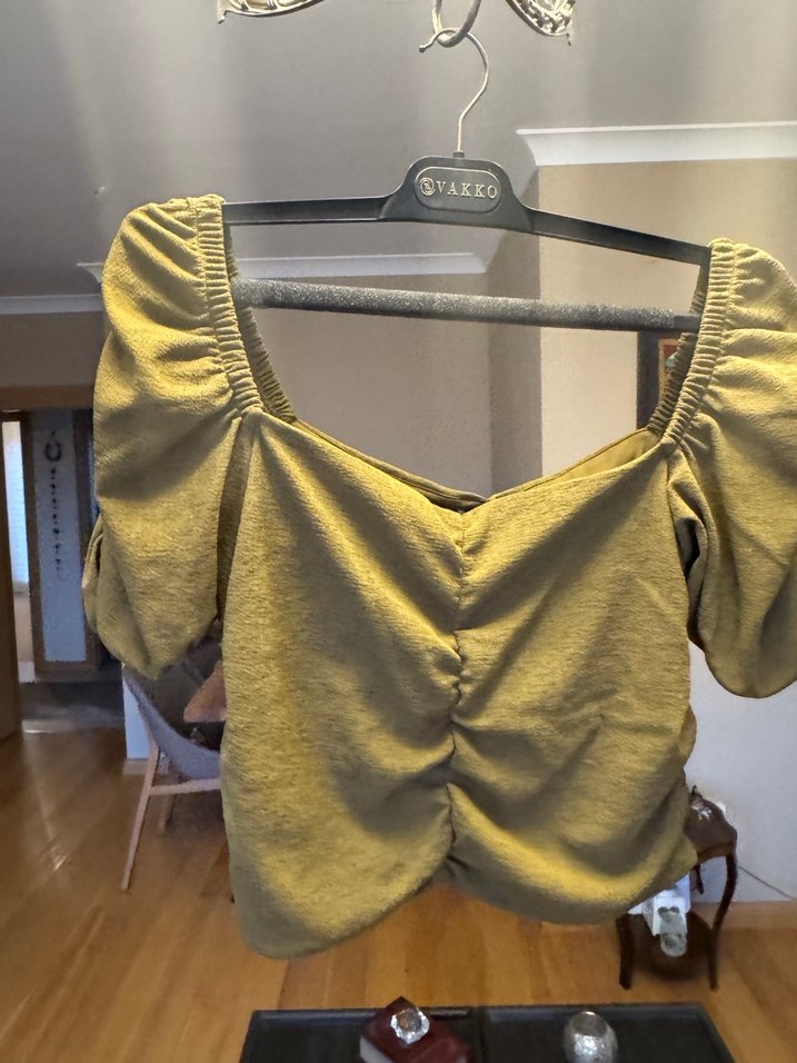 Haki yeşil renkte keten kumaştan, V yakalı ve kısa kollu drapeli, crop boyda, rahat kesim günlük sokak stili bluz.