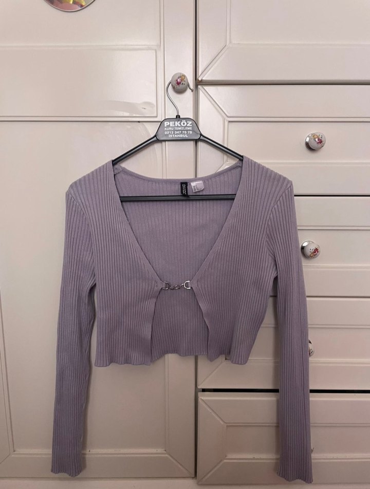 Mor renkli, ince örgü kumaştan yapılmış, uzun kollu, V yaka ve minimal tarzda hırka. Defosuz
