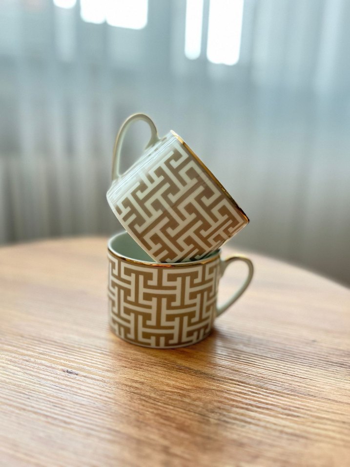 2 adet fiyatıdır Bej ve gri geometrik desenlere sahip, kulplu seramik fincan seti. Sıcak içecekler için uygundur. ☕